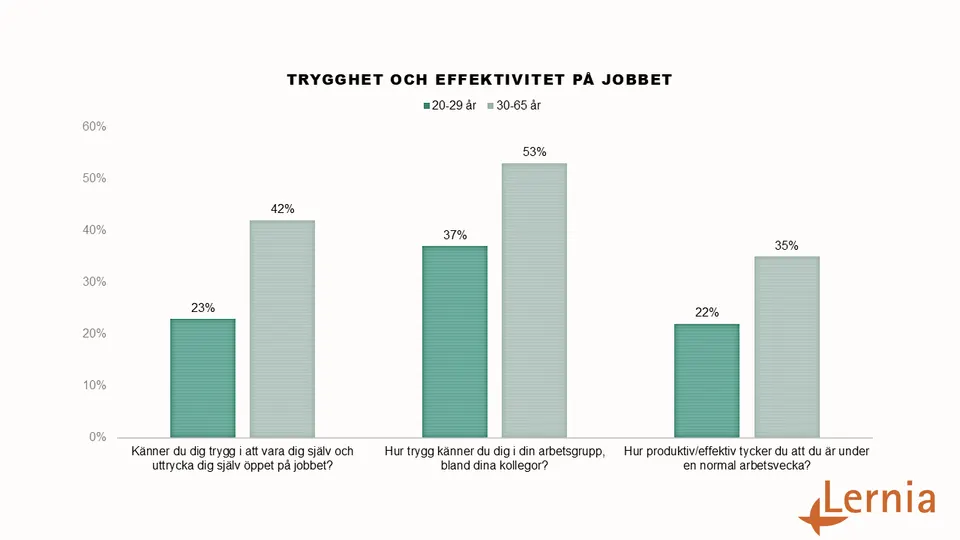 Unga skattar sig också lägre på frågan: “Hur produktiv/effektiv tycker du att du är under en normal arbetsvecka?” 22 procent skattade sig som mycket produktiv/effektiv på en femgradig skala. Bland övriga respondenter i undersökningen ligger motsvarande siffra på 35 procent. Unga svarar också i mindre utsträckning att de är mycket trygga med sina kollegor på jobbet.
